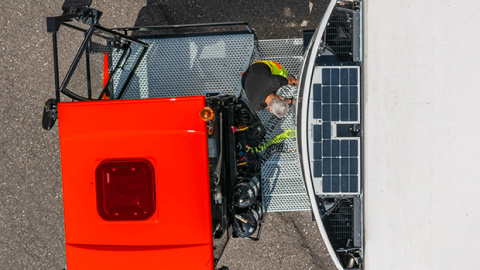 En el techo de la cabina hay una luz intermitente. También hay dos faros de trabajo traseros de LED, que se pueden girar hacia los lados.