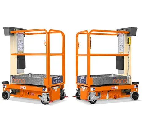 Cinq modèles de nacelles à mât vertical à propulsion manuelle. Hauteurs de levée de 5.79 m à 12.42 m. Idéales pour les entretiens courants ou les inventaires.