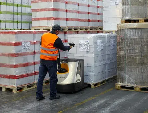 Ce transpalette électrique à haute levée permet aux opérateurs de travailler à hauteur ergonomique et ainsi de limiter les troubles musculo-squelettiques (TMS).