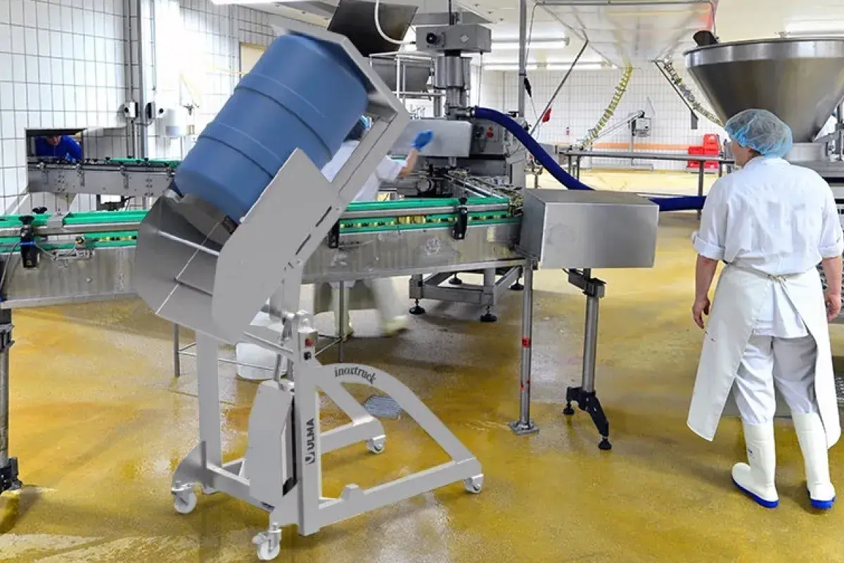 Les retourneurs et basculeurs ULMA Inoxtruck sont dotés d’un système d’inclinaison allant jusqu'à 130° qui permet de manipuler et de renverser des charges telles que des bidons, des chariots cutter ou des eurobins sur des convoyeurs à bandes, dans les conteneurs, les pétrins, les broyeurs, les mélangeurs et les bacs Europe de manière totalement ergonomique et en réduisant les efforts.